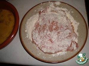 Затем хорошо отбитый кусок мяса сначала обваляем в муке