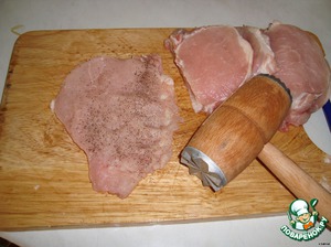 Мясо (у меня свинина)режем на порционные куски. Каждый отбиваем. Солим и перчим