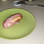 Оберните фаршированные сосиски ломтиками грудинки, закрепив их деревянными шпажками.
