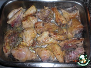 Курицу посыпать специями, солью и выложить плотненько в глубокий противень.