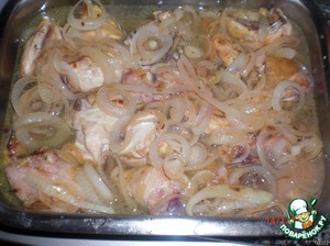 Залить аккуратно луком с вином, чтобы лук оставался сверху. Добавить немного воды (где-то 1 стакан), чтобы вся подлива почти покрывала курицу.