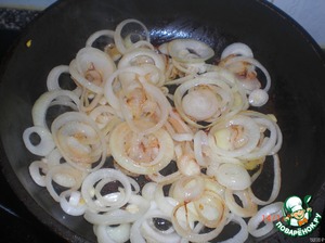 Лук порезать кольцами и обжарить до золотистого цвета, добавить вино и потушить пару минут.