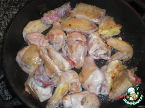 Молодую курочку порезать небольшими кусочками и обжарить на сковороде.