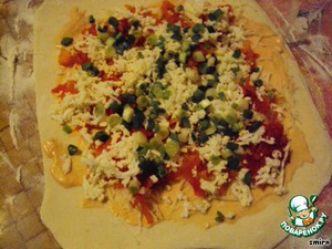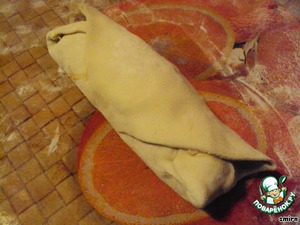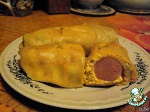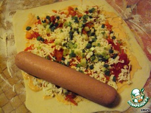 Кладём сосиску на угол и аккуратно заворачиваем.