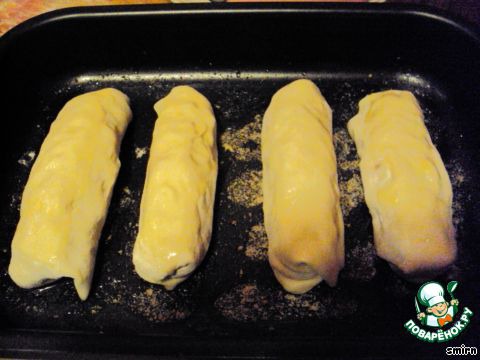Смазываем противень маслицем и присыпаем панировочными сухарями. Выкладываем на противень наши изделия швом вниз. И в духовочку на 15 минут при температуре 180 градусов.