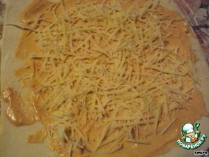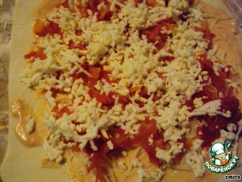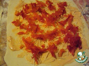 Тесто раскатать, поделить на восемь квадратов такого размера, чтобы легко можно было укутать сосиску полностью. Далее промазываем наш квадрат соусом.