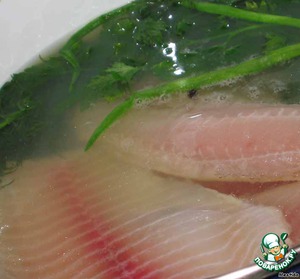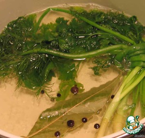зелень (лучок, петрушку, укроп), лавровый лист, перец горошком, положить в кастрюльку, залить 3 стаканами воды, довести до кипения, посолить, поперчить