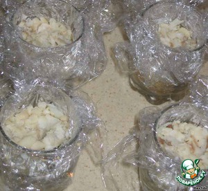 • Небольшие стаканчики застелить пленкой выложить на дно измельченные хлебные палочки, в каждый стаканчик положить по 2-3 ст. л. рыбного бульона и убрать в холодильник минут на 10, чтобы палочки пропитались бульоном