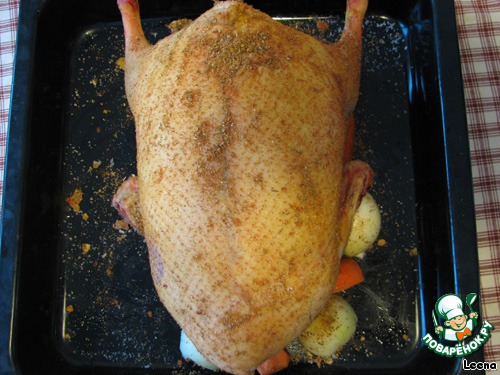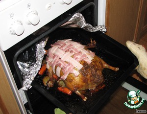 Сверху уложили утку грудкой вверх, швом вниз. Хорошо накрыли фольгой.