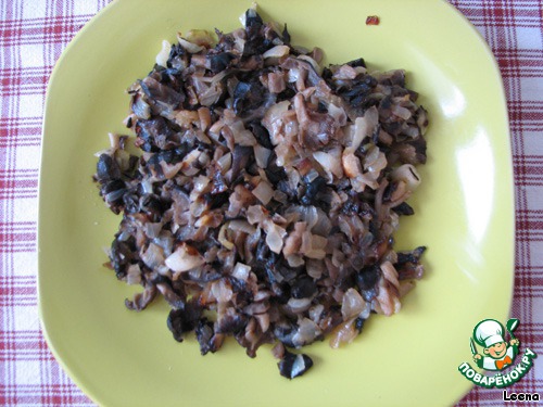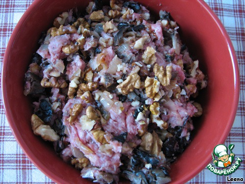 Вторая: мясной фарш, обжаренный с грибами лук, орехи, соль, специи.