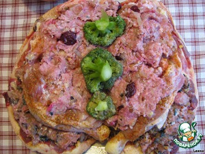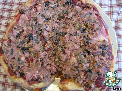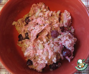 Первая: мясной фарш, лук, вишня, крошки, соль, специи.