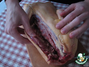 Из утки нужно вынуть все кости (кроме голеней и крылышек). Начинать нужно со спинки, постепенно нарезая по скелету и открывая тушку "как книжку". Затем нужно удалить хвостик и лишний жир.