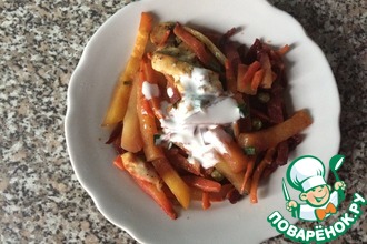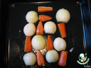 На противень, смазанный маслом, мы выложили овощную подушку - морковь и лук. Это для того, чтобы мультиптица не пристала к противню.