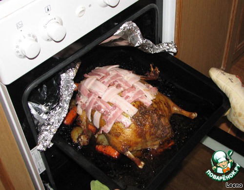 Запекалась красавица почти 3 часа при 180 градусах. За полчаса до окончания нужно удалить фольгу и украсить плетенкой из бекона.