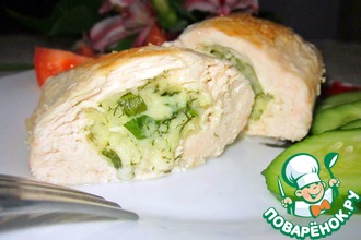 Далее кладем курицу. Аналогично обсыпаем ее специями и солью. И выкладываем мясо-вишневую начинку. Сверху усаживаем брокколи.