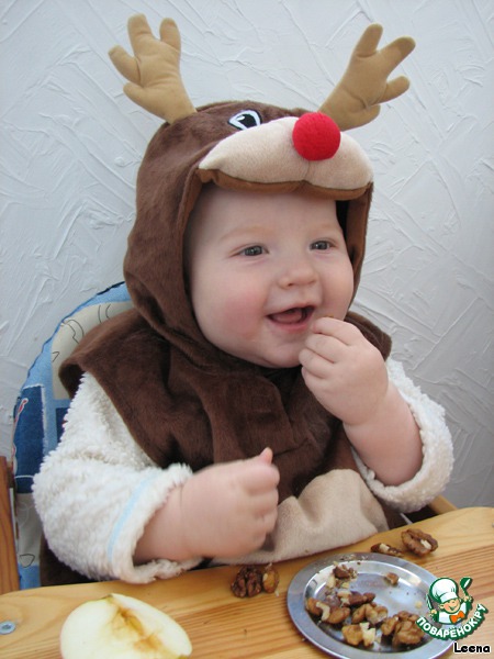 Полдела сделано! Теперь готовим два вида начинки. Первым делом я попросила нашего маленького олененка Коленьку почистить орешки.