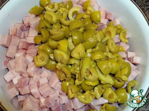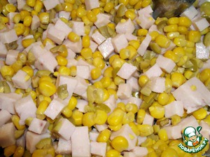 Смешать все ингредиенты, заправить майонезом с огурчиками.