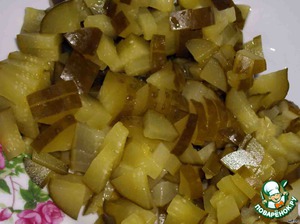 Нарезать соленый огурец тоже мелко и смешать его с майонезом.
