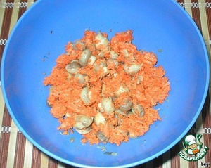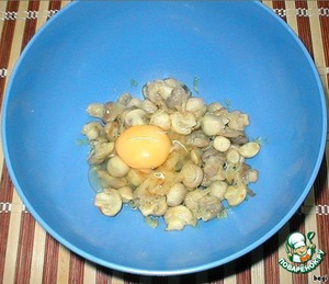 • Грибную массу остудить, добавить яйцо (лучше, если его взбить), посолить и перемешать.
