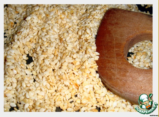 На разогретой сковороде прокалить семечки кунжута, чтобы они не были сырыми на вкус! Быстро подгорают, поэтому не спускайте с них глаз и помешивайте.