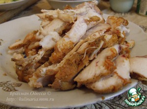 - Достаем наше копченное филе, даем ему слегка остыть и режем на более-менее тонкие слайсы.