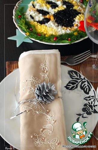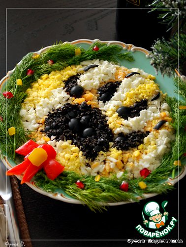 Салат "Тигриный след". Этот простой, но сытный салат придумал мой муж несколько лет назад и прислал рецепт в смске с просьбой приготовить на ужин. Я до сих пор его хранила в телефоне, вот и пригодился. Идея оформления тоже принадлежит супругу, еще немного подразним вас икоркой. На конкурс "Gorenje: новогодняя композиция"