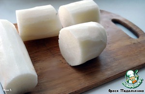 Подсвечники делаются из редиса дайкон. Его помыть, почистить, нарезать на одинаковые куски.