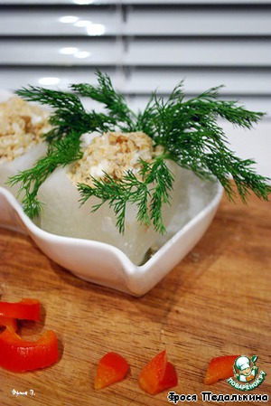 В блендере измельчить 1/3 оставшегося дайкона, сыр адыгейский и грецкие орехи. Скумбрию очистить от костей и кожи, порезать на небольшие кусочки. Начинку придумывала по ходу пьесы, очень удачно получилось.