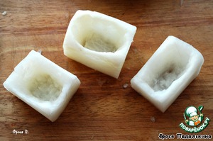 Серединку выскрести ножом или спец. ложкой. Обрезки редисочные сохраняем, пригодятся.