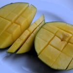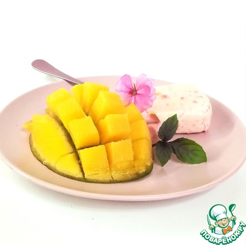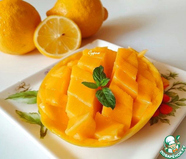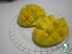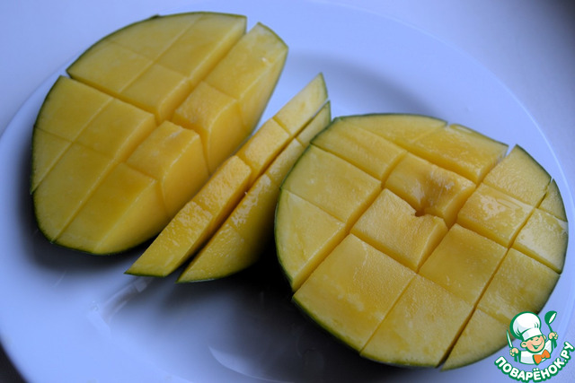 Удалить косточку манго, разрезав его поперек наполовину (вдоль косточки). Затем на каждой половинке сделать надрезы в виде "решетки", не прорезая кожицу. Когда "решетка" будет готова, половинку нужно вывернуть, чтобы "решеточка" разошлась.Чуть сбрызнуть соком одной дольки свежего лимона.