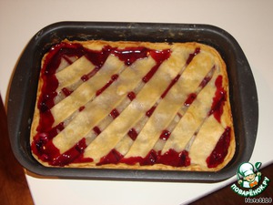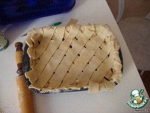 6 Из второго куска теста раскатываем такой же пласт и нарезаем из него полоски шириной 2,5 см. Укладываем их на пирог крест-накрест. Лишнее тесто срезаем, аккуратно заворачиваем края.