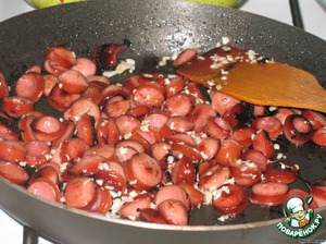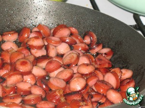 Сначала нарезаем колечками сосиски и обжариваем с небольшим количеством растительного масла.