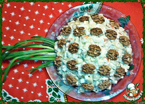 Выложить на большое блюдо салат горкой и украсить половинками грецких орехов и сбоку выложить перья зеленого лука, имитируя ботву настоящего ананаса. -