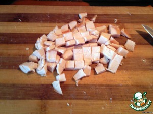 Затем копченую грудку тоже нарезаем средними кубиками.