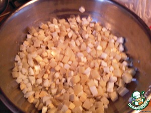 Отвариваем картофель, яйца и нарезаем средними кубиками.