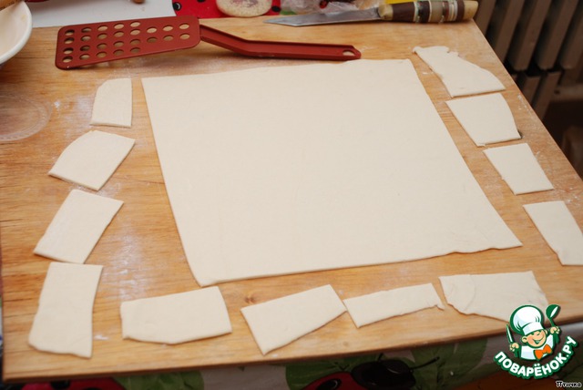 Раскатываем ооочень тонко!!! Я некоторые не очень добросовестно раскатывала, слишком толстенькие вышли. Вырезала квадратик, у меня блюдо квадратное, под него и вырезала, резала все на глаз, поэтому кривоватые вышли. В следующий раз буду делать по шаблону.