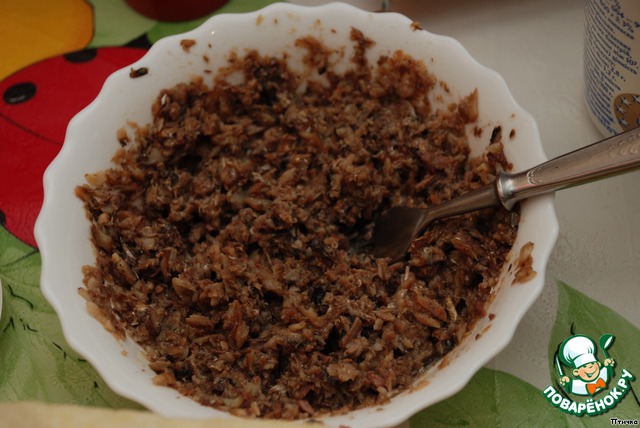 И теперь все собираем. На первый слой выкладываем нашу смесь с сыром, яйцо и чесноком.