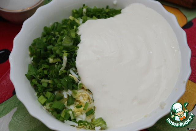 берем оставшиеся три яйца, из одного выковыриваем желток, оставляем на последний слой. Яйца трем на мелкой терке, добавляем мелко порезанный лучок (немножко лука опять же оставляем для последнего слоя), сметану и перемешиваем все.