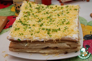 Вот такой закусочный тортик попробовала у друзей, очень понравился, порылась на сайте, не нашла, взяла у них рецепт и выкладываю, что получилось. Если вдруг уже есть что-то подобное, не бейте тапками, честно, не нашла и ела я такое в первый раз, так что лучше говорите, удалю, чтоб не было как с подсолнухами и тирамису ))) А то сама смеялась и выложу очередное «Оливье» )))