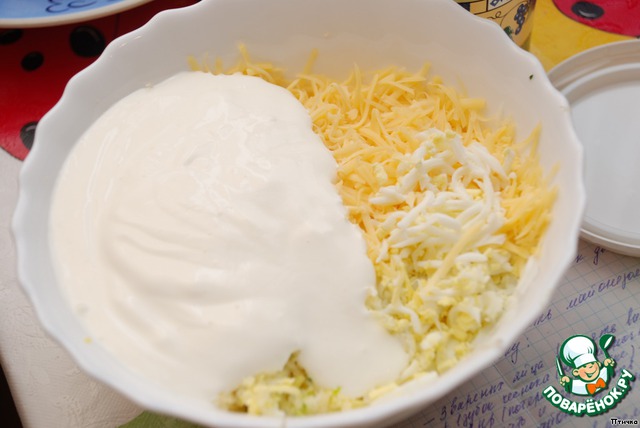 трем на мелкой терке сыр, часть оставляем на присыпку верхнего слоя, все остальное высыпаем в мисочку, туда же трем яйца – 3шт., и выдавливаем чеснок. Добавляем сметану, перемешиваем. -