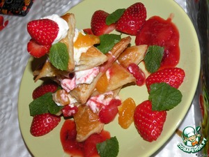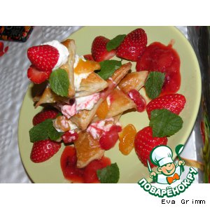 Треугольник-крем-клубника, соус вкусный, мандаринка.