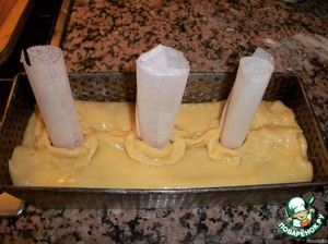 Из бумаги для выпечки вырезаем небольшие прямоугольники, сворачиваем их в трубочки и вставляем в тесто. Они нужны для того, чтобы в них скапливалась жидкость, вышедшая из мяса. Взбиваем яйцо и обмазываем сверху полученный "пирог".