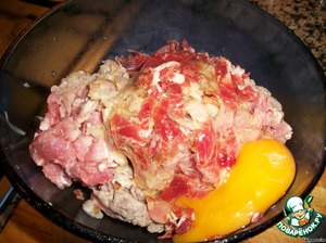 Тоже добавляем в мясо. И туда же разбиваем яйцо. Подкорректируйте мясо на соль и перец. Перемешать все как следует и оставить.