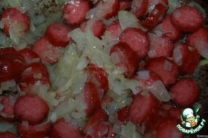 Когда лук принял красивый золотистый цвет, добавляем колбаски и готовим еще 5 минут. Кстати, если под рукой имеются, скажем, ребра копченые, грудинка, подчеревок или еще какая сногсшибательская снедь, ее с удовольствием можно пустить в дело.