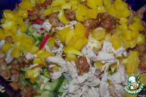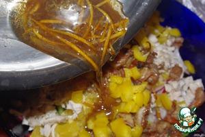 Салат перемешиваем и заправляем маринадом от креветок (вот такое безотходное производство). Солим по вкусу, но так как в маринаде была соль, аккуратно.