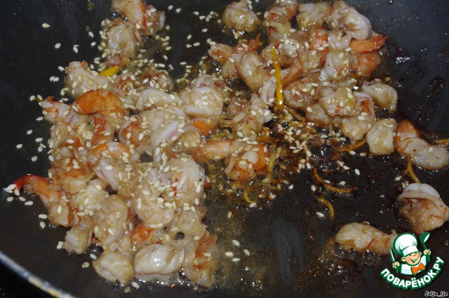 Креветки обжариваем на горячей сковороде без масла (в маринаде его достаточно), но от маринада отцеживаем, он ещё пригодится.