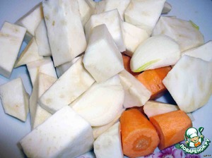 Очищаем лук, морковку, сельдерей - все нарезаем крупными кусками.