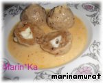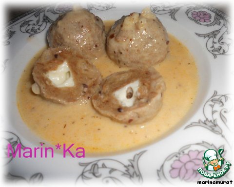 Положить в ямочку 3 кубика сыра (если у Вас сыры разного типа, то, естественно, по одному каждого типа). Закрыть "ямочку" и ещe раз хорошо скатать шар. Важно, чтобы шар получился без трещин, так как во время варки может развалиться!