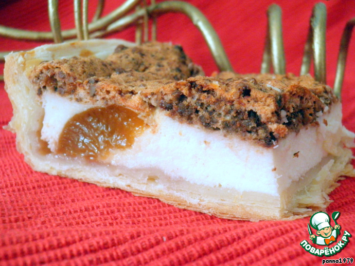 Нежный пирог на основе из песочного теста, с легкой творожной начинкой, с фруктовой прослойкой. И шоколадно-ореховая верхушка. Очень вкусно. И готовить совсем несложно, да и продуктов особенных не требуется.