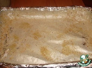 3. Форму выкладываем фольгой, обмазываем сливочным маслом, обсыпаем панировочными сухарями